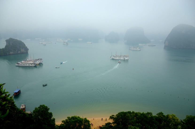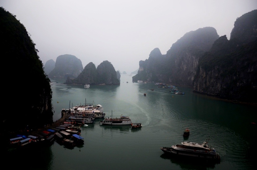 Lucas tenia raó: malgrat tot -el turisme de masses-, la Bahia de Halong és un imprescindible en qualsevol viatge mitjanament complet a Vietnam. En el nostre cas, hem passat dos dies sense veure el sol, navegant entre les boires en una mar bruta i saturada de creuers; amb una temperatura més bé baixa i el confort mínim. I amb tot, ha merescut la pena. I és que un paisatge com el que hom troba ací no és assimilable a res que un puga imaginar. En fotos (i sense quasi llum):
