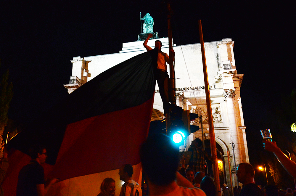 Viendo la reciente paliza histórica a Brasil, y a Messi arrastrando las patitas por el campo desde hace meses, la victoria de Alemania parecía cantada. Costó lo suyo, pero al final la cantaron. Ciento doce minutos tuvieron que esperar, en concreto, para poder descerrajar a los argentinos. Götze, gran jugador y mejor niñato, tuvo su iniestazo. Y Alemania su cuarto título del mundo de fútbol. Fútbol, bonito palabro intercontinental. Al Weltmeister quería yo llegar. No todos los días se está en Múnich viendo ganar la Copa de Mundo a Alemania. Tal cual: pitido final y a la calle. Richtung Marienplatz. Sospecho que nosotros salimos precipitados, medio empujados por la llegada de la medianoche, un poco porque hoy se trabajaba y otro tanto porque esperar a la recogida de la copa y el abrazo a los jugadores de mutti Merkel nos la sudaba. Al llegar a la plaza, un panorama muy muniqués. Doscientos tipos aparentemente muy contentos más tiesos que la mojama, aunque debidamente uniformados; un montón de banderas; a tope de birras, y cuatro exaltados manejando el cotarro del aburrimiento supino. Eso sí, quince furgones de policía y madera, mucha madera. Hasta uno de los maderos filmando en directo las alegrías de los radicales. Estaba claro que ese no era el lugar de la celebración. Siguiendo a la marabunta, nos dejamos empujar hacia Odeonsplatz y la Ludwigstrasse. Cinco minutos más allá alcanzamos por fin el punto de encuentro. Ahora sí. Lo supimos por el incremento de dos coma cinco puntos en la intensidad del ruido y por el gentío. Y pare usted de contar. Allí no estaba Reina llamando al camarero a por una de mero, ni tampoco la brasileña del Cafe Munich que baila a piñón fijo hasta que la desconectan, ni el brasas argentino, ni una maldita carroza, ni otro disfrazado de Merkel, ni, ni, ni… Dejad de imaginar espectáculos, es inútil. Festival de la sosería que no lo anima ni un campeonato del mundo ni leches. Bueno, unas ostias igual si lo hubiesen animado, pero para eso hacen falta muchas helles y en domingo por la noche, ni esas. Volviendo a la realidad. Lo que vimos caminando entre la Odeonsplatz y el Siegestor fue simplemente a la muchedumbre. Un carril teutónico que subía para arriba a grito pelao. Deutschland! Por eso les reconocía uno la alegría. Bueno, por eso, por el olor a cerveza, las banderas y las camisetas, bla, bla, bla. Nada de bailar. Nada de descojonarse. Nada de grandes alardes de alegría. Que esto no es Mamaluf, señores. Otro rato entre el gentío y por fin nos tropezamos con un malo, malo, malote. El que colgó la bandera gigante del semáforo. Ante el Arco del Triunfo. Tuvo que intervenir la Polizei, siempre al acecho, que se nos va de las manos. Al rato otro tiró una bomba de humo. Aquí otro más, el ingenioso, que se ha fabricado una réplica gigante de la Copa del Mundo. Es que son la monda. Y el de la vuvuzela, con menos ritmo que Ximo Bayo pasado de farlopa. La fiesta se animaba, en todo caso. Una pavita, atrevida ella, se subió al fin a lomos de su noviete y agitó su banderita. Todo en diminutivo, como su voz de pito, imprescindible para una jovenzuela muniquesa recatada. Pero que contentos estamos hoy. Y somnolientos. Hora de ir a dormir, la noche avanzaba a raudales y las bocas de metros no paraban de escupir a celebradores. No había para menos. Más en condición de observadores internacionales, en una especie de lección aplicada de antropología, entramos entonces en fase de hartazgo. Modo retorno a casa on. De vuelta, pasada la una de la noche, la masa parecía acompañarnos calle de Luis abajo. Veredicto: aquello, lo de Múnich, fue más bien una especie de pasarela de camisetas de la mannschaft en la que los gritos estaban permitidos, incluso bien vistos. Y poco más. Pues eso, todos pa casa, nosotros y ellos, que mañana hay que trabajar. Pero que les quiten lo bailao, y cuatro años de orgullosos devoradores de sesos que no serán argentinos sino germanos. Porque mia san Weltmeister. Antes de acabar, un matiz: no os quede la menor duda, yo que me alegro. Lo que pasa es que pongo contento a la muniquesa, como muy comedido.