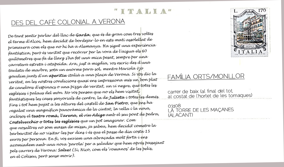 De tant sentir parlar del llac de Garda, que és de gran com tres voltes el terme d’Alcoi, hem decidit de bordejar-lo en este matí assolellat de primavera com els que no hi ha a Alemanya. Ha sigut una experiència fantàstica, però és veritat que recórrer per la vora de l’aigua els 60 quilòmetres que fa de llarg s’ha fet una mica pesat, sempre per una carretera estreta i atapeïda. Ara, just a migdia, vos escric des d’una tauleta de marbre, sota un enorme para-sol, mentre Mariola i jo gaudim junts d’un aperitiu italià a una plaça de Verona. Si vos dic la veritat, en les nostres condicions quasi ens impressiona més un bon plat de canelons d’espinacs o una pizza de veritat, un vi negre, que totes les esglésies i palaus del món. No vos penseu que no els hem visitat, fantàstiques les cases senyorials de centre, la de Julieta i totes les demés. Fins i tot hem pujat a les altures del castell de San Pietro, que ens ha regalat una magnífica panoràmica de la ciutat, la vella i la nova, inclosos el teatre romà, l’arena, el riu Adige amb el seu pont de pedra, Castelvecchio o totes les esglésies que un pot imaginar. Com que nosaltres no som massa de missa, ja sabeu, hem decidit cometre la barbaritat de no visitar-les per dins i és que el passe de dia costa 15 euros per persona. En fi, vos enviem una abraçada molt forta, i ens acomiadem amb una nova ‘parola’ per a saludar que hem après passejant pels carrers de Verona: Salve! (Sí, Nico, com els ‘romanos’ de les pelis en el Coliseu però sense morir).