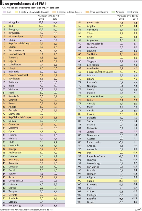 “¿Tenéis pensado volver algún día a casa? ¿Cuándo?”. Son dos en una, la pregunta del millón. La que nos repiten a los expatriados madres, tías, suegras, vecinos, abuelos, sobrinos, amigos o antiguos compañeros de pupitre vía facebook. Por ahora, lo más parecido a una respuesta para darles lo tenemos cada día en los periódicos, en los telediarios, en noticias y en gráficos como el de aquí abajo (publicado en ELPAÍS.com). Solo hay que mirarlo y lo veremos claro: mientras España se sitúe en la vanguardia a nivel planetario en decrecimiento económico (previsión de crecer un -1,3% también en 2013) va a ser que no. Hoy no; mañana (parece que) tampoco.