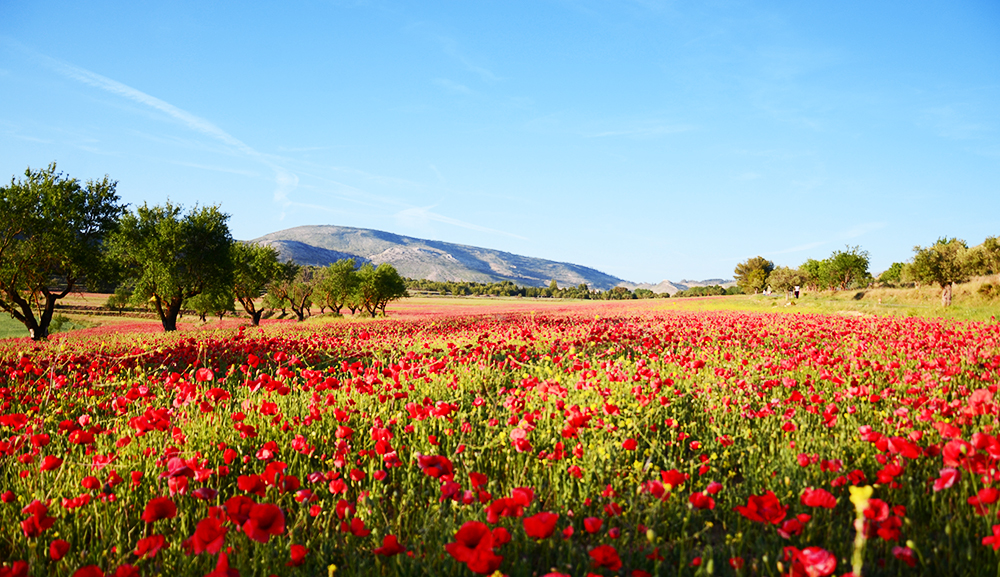 No sé si és la sequera, real, o són coses del meu cervell influenciat com està pels paisatges de l’antagònica Baviera, però cada vegada que pose els peus en la terreta tinc la sensació que el desert se’ns està engolint i que fins i tot ens té a mig rosegar. Terrible la vista des de l’aire, just abans de prendre terra a l’aeroport d’Alacant, quan per molt que m’esforce no veig verd per enlloc. Serra amunt, una vegada passada eixa frontera que hui fixen Tibi o Xixona, sempre acabe alenant i respirant al cap i a la fi una mica més seré. A la muntanya, a casa, el desert haurà d’esperar un poc. Això sí, ens té a tir d’incendi forestal. Passejant l’altre dia per la Torre en busca d’eixos paisatges que em fan sentir una mica més tranquil em vaig topar amb este camp de roselles als Castellans. Haguera preferit trobar-me les cabres de Gusman i un talló de mig metre de blat, com fou algun dia, això potser és massa demanar. Per a l’any vinent.