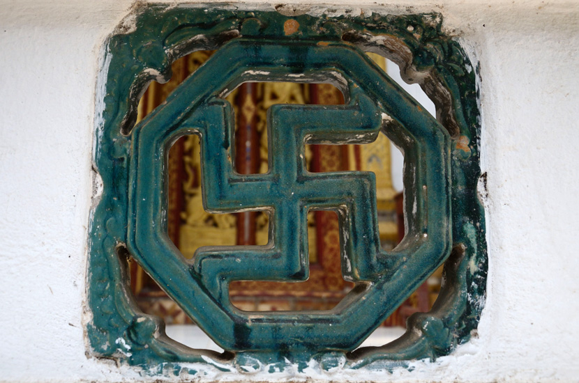 Abans de passar definitivament de pàgina amb açò del viatge al sud-est asiàtic hi ha algunes coses, poques, que voldria comentar al Quadern. Com allò de les esvàstiques. I tant que havia llegit que l’origen de la creu gamada està darrere de l’hinduisme o que encara hui és un símbol important per a determinades comunitats religioses a Àsia, especialment en l’univers budista on té diferents significats -tots bons-. I altres coses, com que a Canadà hi ha una comunitat des de fa més d’un segle que porta per nom Swastika, que a més etimològicament significa alguna cosa així com Gemütlichkeit o benestar. Però de la teoria a la pràctica sempre hi ha certa distància i, com que a Europa hi ha un tabú enorme des que els nazis van fer seu aquest símbol, no vaig poder evitar l’impacte de veure esvàstiques pràcticament per tot arreu. I les vaig començar a fotografiar. Diria que on més en vàrem trobar va ser a Laos, especialment a Luang Prabang on gairebé hi havia un temple budista a cada cantonada. Desconec les dades, però ens va quedar la sensació que la religió segueix sent important al país. Va ser un dels llocs on més monjos ens vàrem creuar pel camí i fins i tot recorde aquell nano que em vaig trobar a l’aeroport de Vientiane amb els seus pares. Vestia una samarreta cridanera amb una esvàstica enorme al pit, impensable a Alemanya on fer una cosa així estaria considerat un delicte. El vaig fotografiar, clar, i li vaig preguntar per allò. No parlaven massa anglés, suficient per a respondre’m que era una cosa especial per a ells i que si els interpel·lava perquè no m’agradava el que veia. “Què va! És molt maca”, els vaig dir. Quasi tantes esvàstiques com a Laos ens vàrem trobar a Vietnam, la majoria ornamentant pagodes budistes. Curiosament, molts d’aquestos símbols han evolucionat en les últimes dècades en esvàstiques levogires, que són creus gamades idèntiques però girades del revés. Ho fan per a no ferir cap sensibilitat, coneixedors de les “noves” implicacions d’una simbologia malgrat tot mil·lenària. No recorde quan, però sí que un dia vaig acabar fart de tantes esvàstiques. Vaig deixar de fotografiar-les.