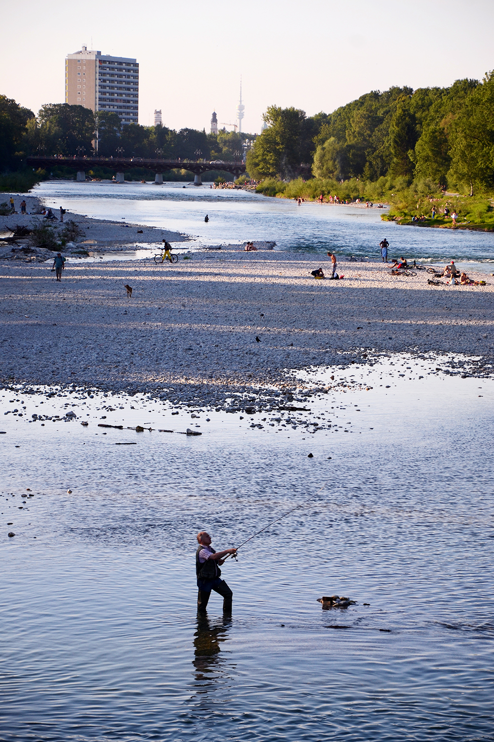 Si l’hivern ha sigut etern i la primavera inexistent aquest any a Munic, el mes de juliol està sent especialment assolellat. I sec. Tant, que per primera vegada en molt de temps es poden veure estos dies a operaris municipals i particulars regant la gespa abans no desaparega del tot dels jardins. A baix de casa, els til·lers han perdut de sobte totes les flors, constatant que l’estiu avança imparable. Un dels millors refugis urbans els dies de calor és el riu, una vegada més. Seré raret, però l’Isar em segueix resultant fascinant dos anys després, amb la seua aigua transparent plena de banyistes a la tarda. L’altre dia em vaig creuar amb un pescador que provava sort a última hora de la vesprada, mentre desenes de persones al seu voltant aprofitaven per a berenar a la llera. De rerefons, només la torre del parc olímpic i alguna xemeneia fora de lloc em van fer recordar que seguia a la gran ciutat. En moments com aquell, idíl·lica gran ciutat.