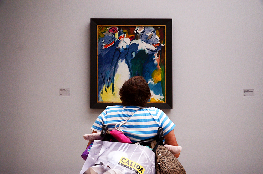 He venido reseñándolo durante varios días y sí, este fin de semana hemos tenido la oportunidad de acudir a la inauguración de la nueva Lenbachhaus. En realidad, solamente me apetece comentar ahora una imagen, la de abajo. Los alemanes son como son, con sus cosas buenas, regulares, malas y pésimas. Como todos. Con esto de la inauguración tengo que reconocerles, en todo caso, un detalle: lo importante de la reapertura del museo, en el que los contribuyentes se han dejado una pasta –como viene siendo habitual–, no fueron los discursos de los políticos ni siquiera la presencia del arquitecto encargado de la obra, Norman Foster. El enfoque ha sido totalmente diferente, básicamente con cuatro días de entrada libre en el que gordos, flacos, guapas, feas, ricos, pobres, alemanes, extranjeras, altas, bajos… hemos podido conocer las instalaciones y los cuadros de Wassily Kandinsky y Der Blaue Reiter gratis. Esto es, los protagonistas han sido la cultura y las personas. En la fotografía una señora con la piel endurecida por la miseria, moviéndose de sala en sala del museo con su vieja silla de ruedas empujada a duras penas por unas piernas hinchadas. En sus bolsas de todo menos la compra. Calle pura y dura. Dentro de la Lenbachhaus, por un rato, ella fue una más. Sé que no es gran cosa, pero lo contrario hubiese sido peor. Pienso en cómo funcionan (funcionaban) estas cosas en España y el detalle se agiganta hasta convertirse casi en algo extraordinario.
